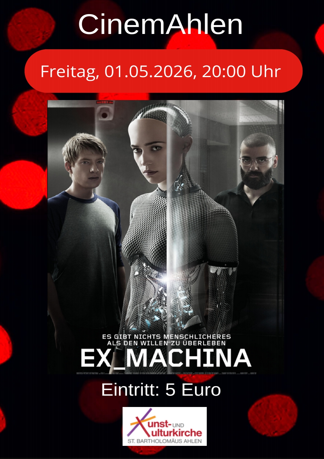Unter dem Motto "Haut" Was zeichnet uns Menschen gegenüber einer KI aus zeigen wir den Film Ex Machina im Cinemahlen. Der Eintritt beträgt 5 Euro.